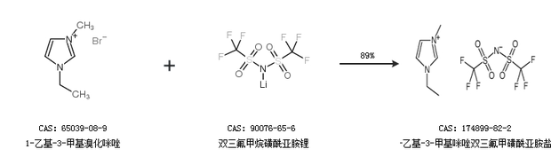 1.通過1-乙基-3-甲基溴化咪唑和雙三氟甲烷磺酰亞胺鋰合成1-乙基-3-甲基咪唑雙三氟甲磺酰亞胺鹽,收率約89%;