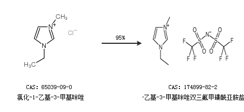 2.通過氯化-1-乙基-3-甲基咪唑合成1-乙基-3-甲基咪唑雙三氟甲磺酰亞胺鹽,收率約95%;