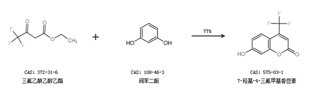 2.通過三氟乙酰乙酸乙酯和間苯二酚合成7-羥基-4-三氟甲基香豆素,收率約77%;
