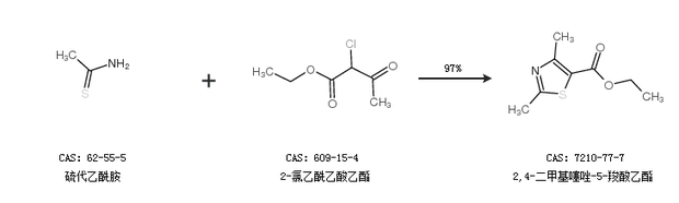 1.通過硫代乙酰胺和2-氯乙酰乙酸乙酯合成2,4-二甲基噻唑-5-羧酸乙酯,收率約97%;