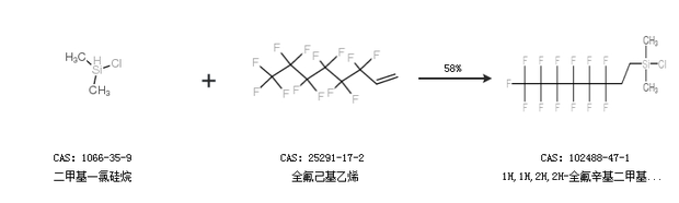 2.通過二甲基一氯硅烷和全氟己基乙烯合成1H,1H,2H,2H-全氟辛基二甲基氯硅烷,收率約58%;