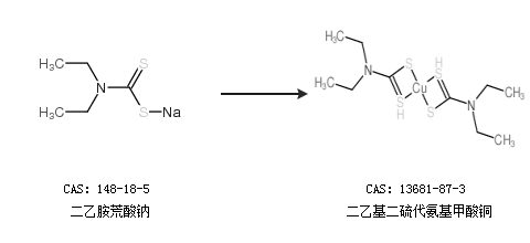 英文別名 	Copper,bis(diethylcarbamodithioato-kS,kS'')-, (SP-4-1)- (9CI);Diethyldithiocarbamic Acid Copper Salt;Copper DiethyldithiocarbaMate;
