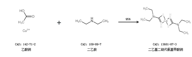 1.通過乙酸銅和二乙胺合成二乙基二硫代氨基甲酸銅,收率約95%;